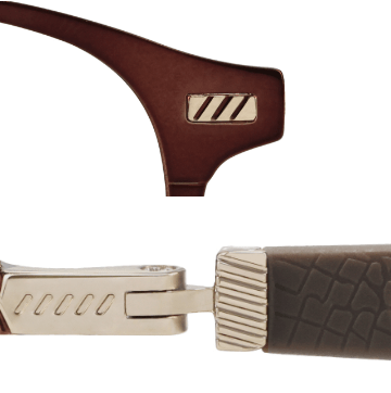 テンプルの内側には、ブランドのアイコンである「コーションロゴ」をメタルプレートで表現。