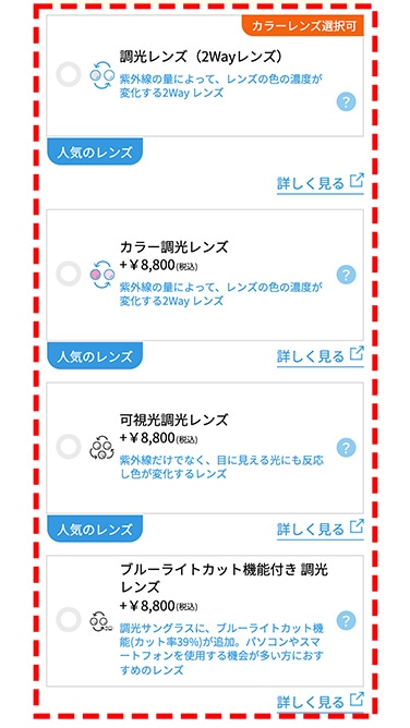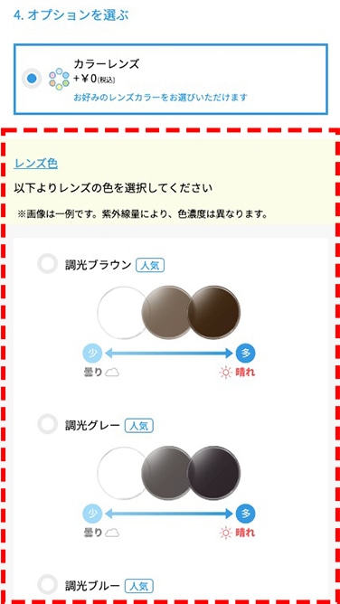 「レンズ選択」画面の「3. レンズの種類を選ぶ」から、「調光レンズ」「カラー調光レンズ」「可視光調光レンズ」「ブルーライトカット機能付き 調光レンズ」いずれかを選んでください。