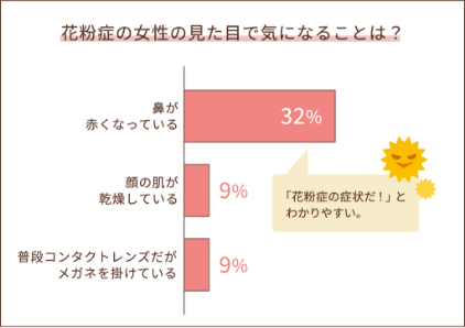 花粉症の症状で圧倒的に男性が気になる見た目は、鼻が赤くなっていること。肌の乾燥やコンタクトレンズからメガネに変えるといった見た目は10%未満と、男性としてはあまり気にならないようです。